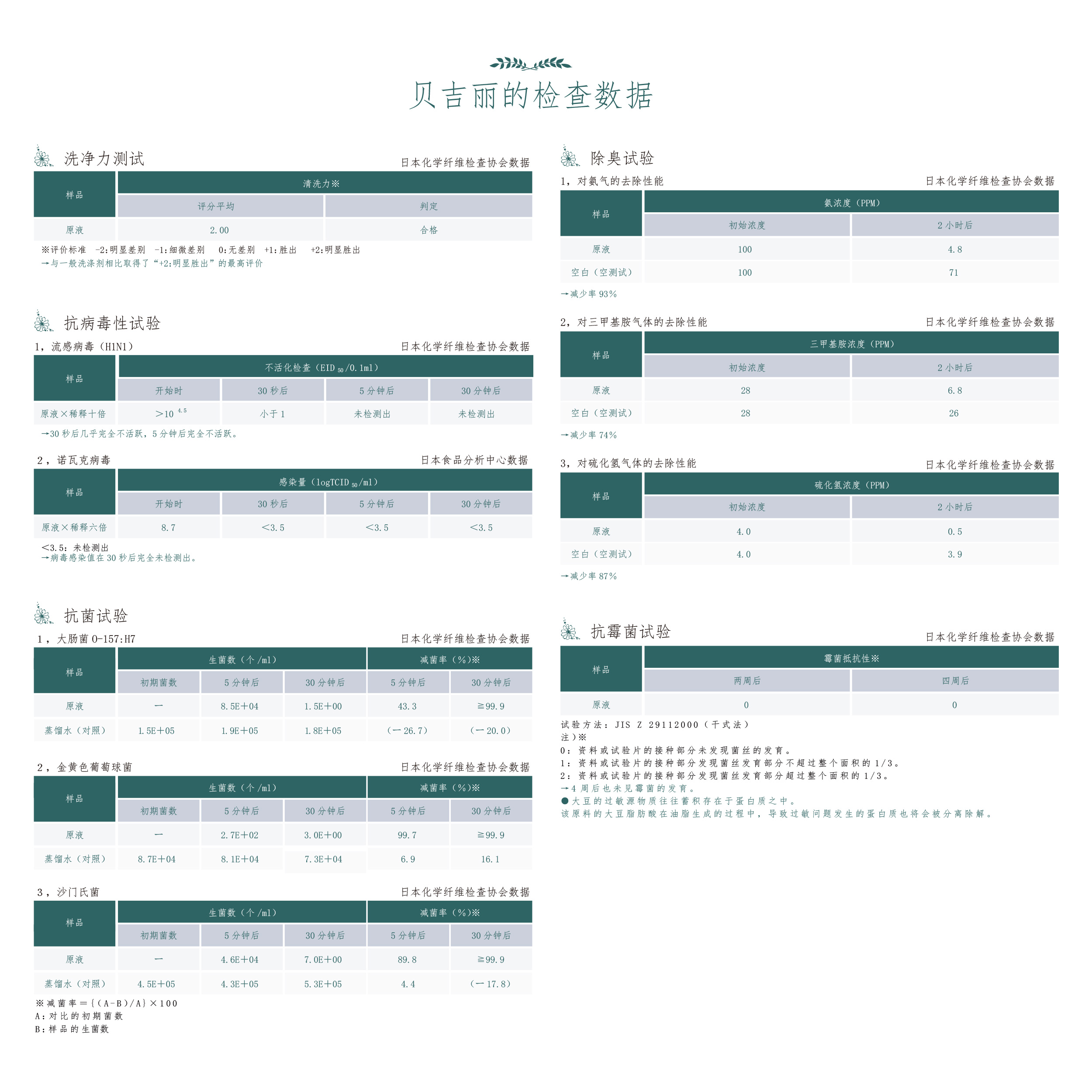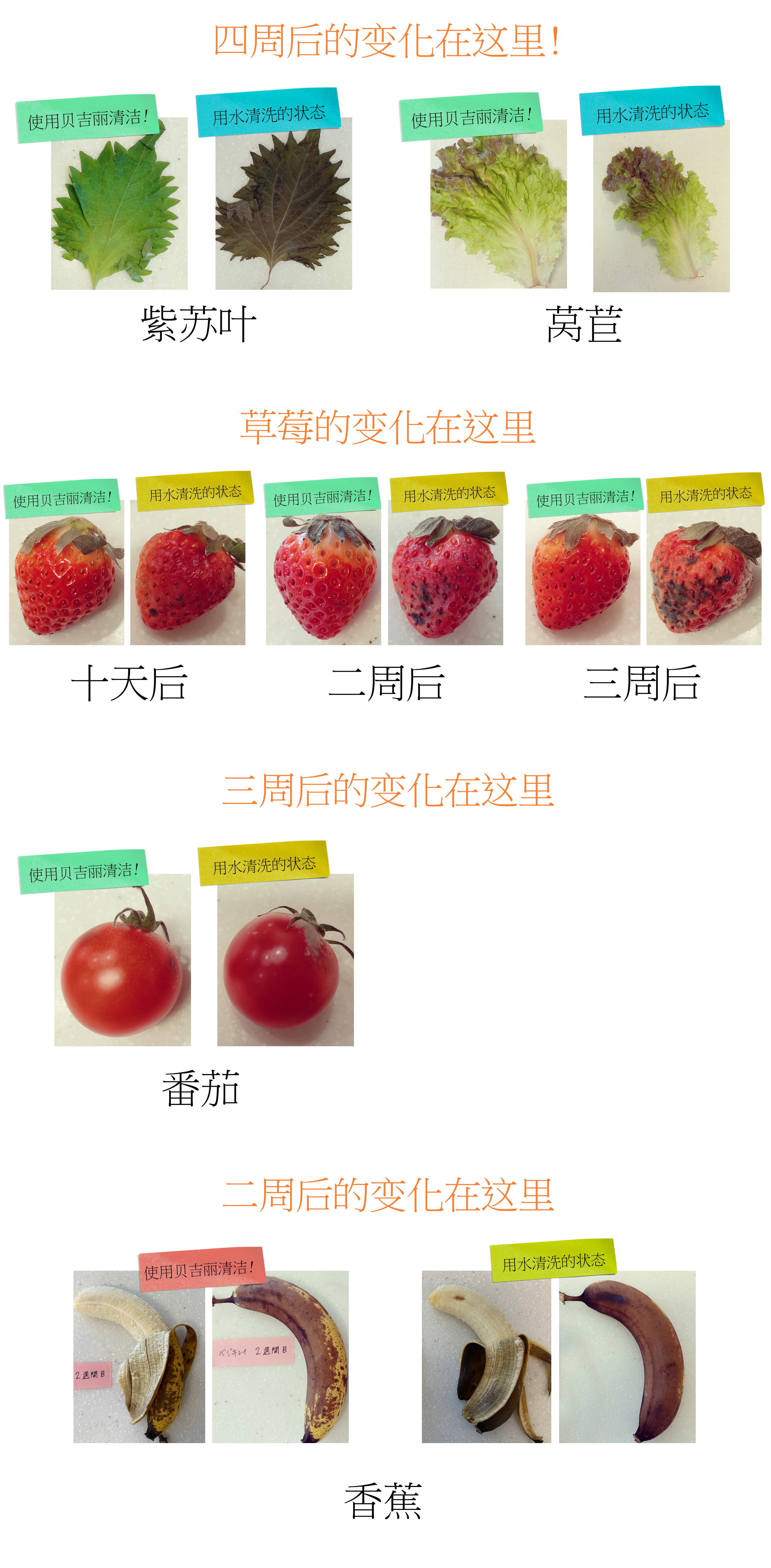 使用贝吉丽进行保鲜实验的结果,与本产品未使用的实验样品相比,保持新鲜度的效果明显(使用莴苣、卷心菜、紫苏叶进行实验)。此外,贝吉丽的除臭效果亦得到了肯定认可。